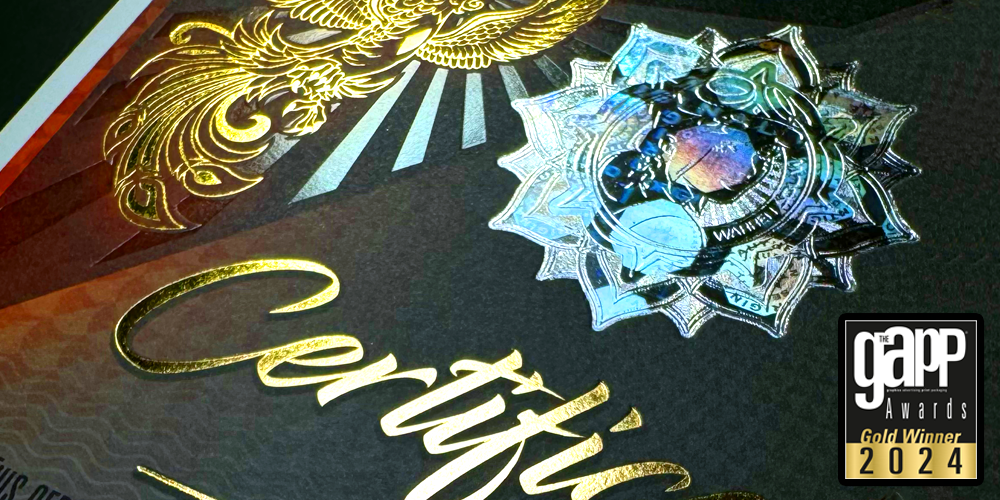 An all new award winning premium certificate of authenticity on the luxurious Crane's Crest 100% cotton paper (362gsm) with intricate gold foiling, clear foiling and holofoil unigram is now available to all high-end original artworks. Available in two tiers, Gold and Platinum.